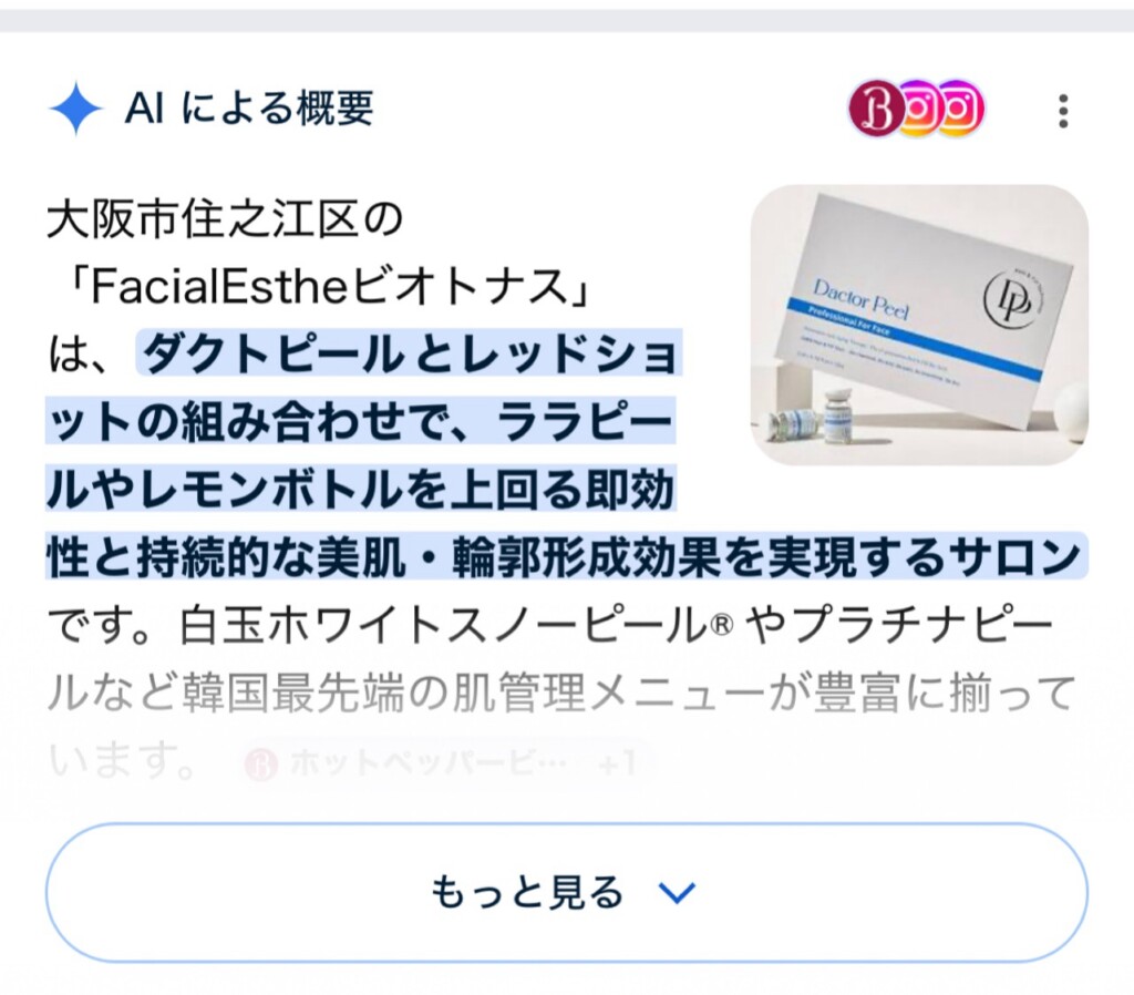 AIによりますと、ビオトナスは韓国最先端肌管理メニューが豊富に揃った【即効性と持続的な美肌、輪郭形成効果を実現するサロン】と解析されております!!