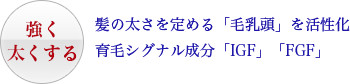 毛髪の太さ・強さは毛乳頭のサイズに比例するため、毛乳頭を構成する毛乳頭細胞の増殖促進が太毛化につながります。IGF、FGFは活動の衰えている毛乳頭や毛乳頭細胞に作用することで、毛包も深く大きく成長し、強く・太い髪を育てることきます。