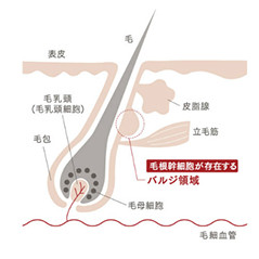 近年、毛包上部のバルジと呼ばれる部分に髪の源である「毛根幹細胞」が存在し、この細胞が毛母細胞へと分化していくことで毛髪が形成されるとする「バルジ説」が育毛治療の主流となってます。